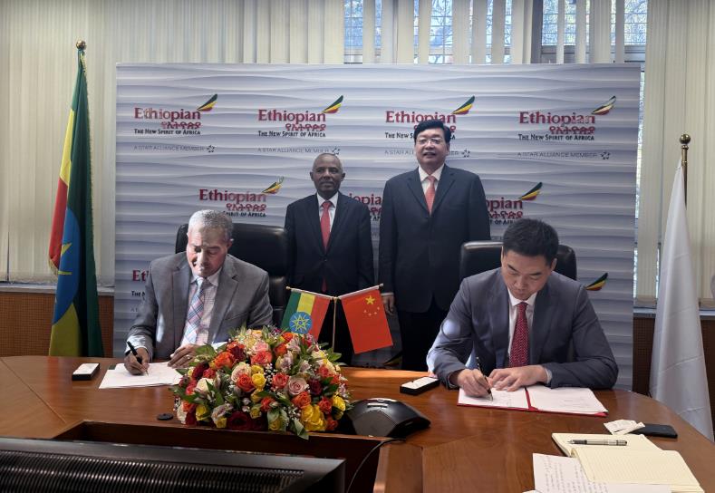 當(dāng)天下午,中豫航空集團(tuán)與埃塞俄比亞航空集團(tuán)在亞的斯亞貝巴簽署合作備忘錄,就深化航空貨運(yùn)業(yè)務(wù)合作、推動(dòng)航空領(lǐng)域全方位合作達(dá)成一致意見。張明超和埃塞俄比亞航空集團(tuán)首席執(zhí)行官M(fèi)esfin Tasew共同見簽。根據(jù)約定,雙方將發(fā)揮各自的區(qū)位、航線、貨源等資源優(yōu)勢(shì),共同推進(jìn)增開中非貨運(yùn)航線,開展貨運(yùn)中轉(zhuǎn)等業(yè)務(wù),探索在海外貨站、機(jī)務(wù)維修、航空培訓(xùn)、仿真模擬設(shè)備研發(fā)制造、航空金融服務(wù)、航空基礎(chǔ)設(shè)施建設(shè)等方面開展合作。簽約前,中豫航空集團(tuán)代表團(tuán)與Mesfin Tasew圍繞鄭州—亞的斯亞貝巴“雙樞紐”建設(shè)溝通會(huì)談。張明超表示,埃塞俄比亞位于非洲、中東和亞洲的十字路口,地理位置優(yōu)越;埃塞俄比亞航空公司客貨運(yùn)服務(wù)全球覆蓋廣泛,是非洲領(lǐng)先的航司之一,雙方優(yōu)勢(shì)互補(bǔ)、合作前景廣闊。中豫航空集團(tuán)將扎實(shí)推進(jìn)與埃塞俄比亞航空集團(tuán)的全鏈條業(yè)務(wù)合作,復(fù)制鄭盧“雙樞紐”建設(shè)經(jīng)驗(yàn),為兩地經(jīng)貿(mào)往來開辟新通道。Mesfin Tasew介紹了埃塞俄比亞航空集團(tuán)的基本情況。他說,埃塞俄比亞航空集團(tuán)愿攜手中豫航空集團(tuán),共同致力“雙樞紐”建設(shè),通過空中走廊把更多的中國商品輸入非洲,也將更多的非洲產(chǎn)品運(yùn)送到中國和世界各地。簽約后,代表團(tuán)一行實(shí)地調(diào)研了埃塞俄比亞航空貨站和維修中心。